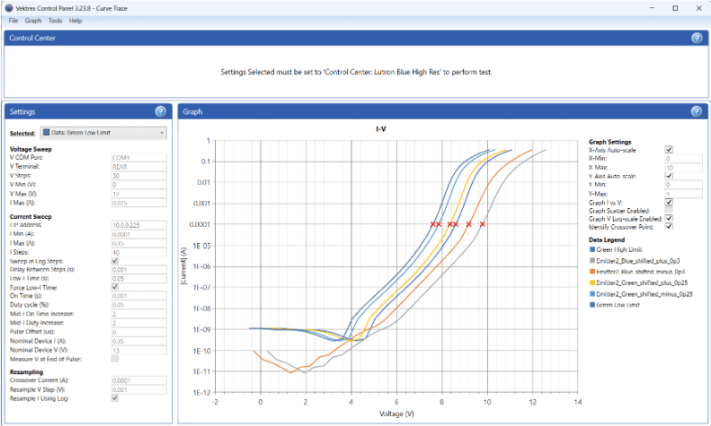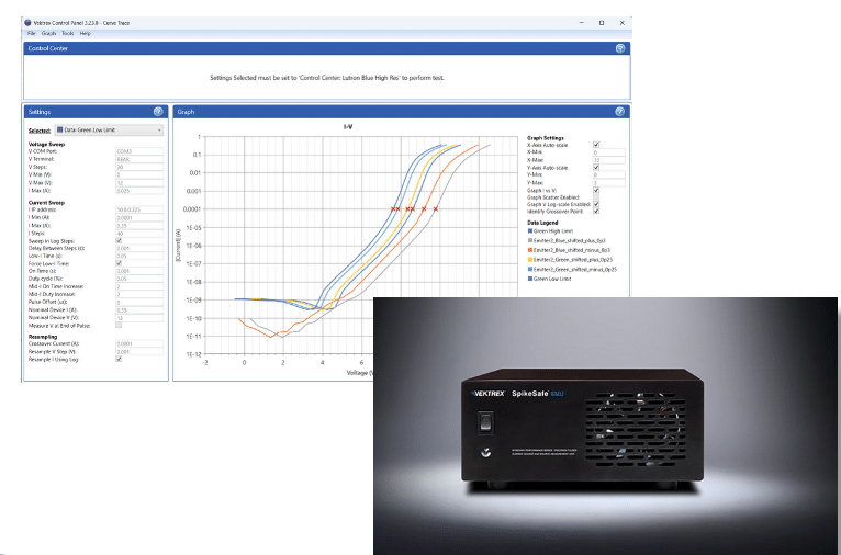 To provide “the best of both worlds,” Vektrex’s new Hybrid Sweep software implements a constant-voltage sweep at low currents and a constant-current pulsed sweep at higher currents. The data from both tests is combined into one graph.